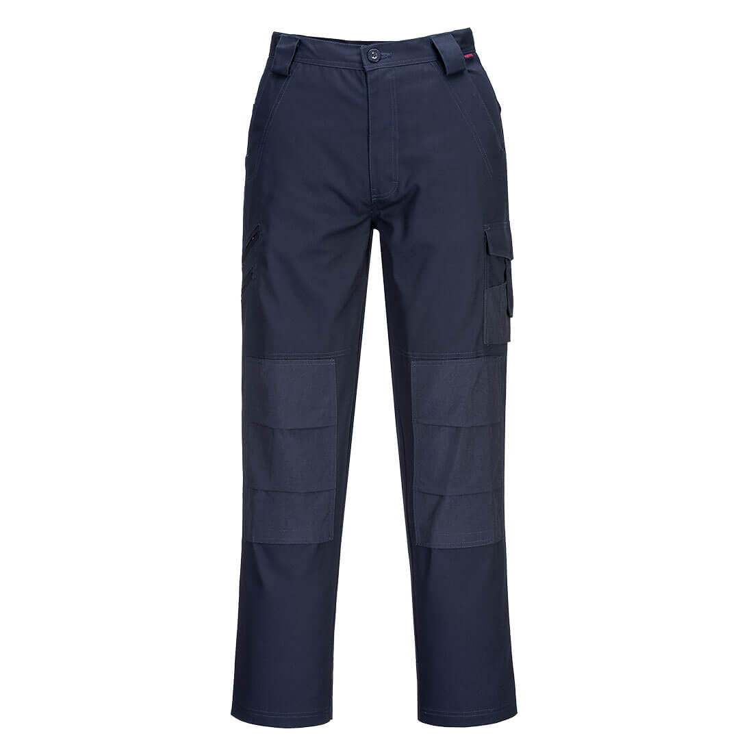 Apatchi poly cotton work pants. Left leg cargo pocket with additional compartments. Right leg has a zipped up, deep pocket as well as an open utility pocket. Both knees have reinforced pads with secured touch tape closure for knee pad provision. Deep hip pockets on the front and large back pockets with touch tape closure. Metal zip and metal button closure.